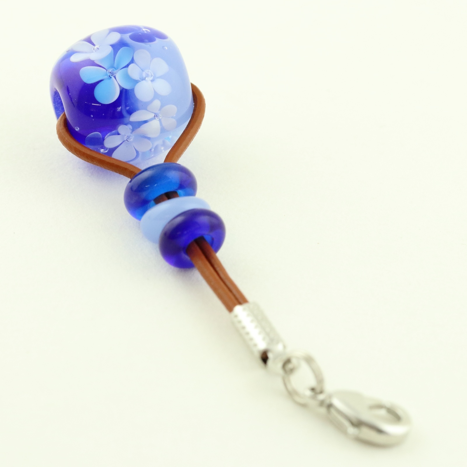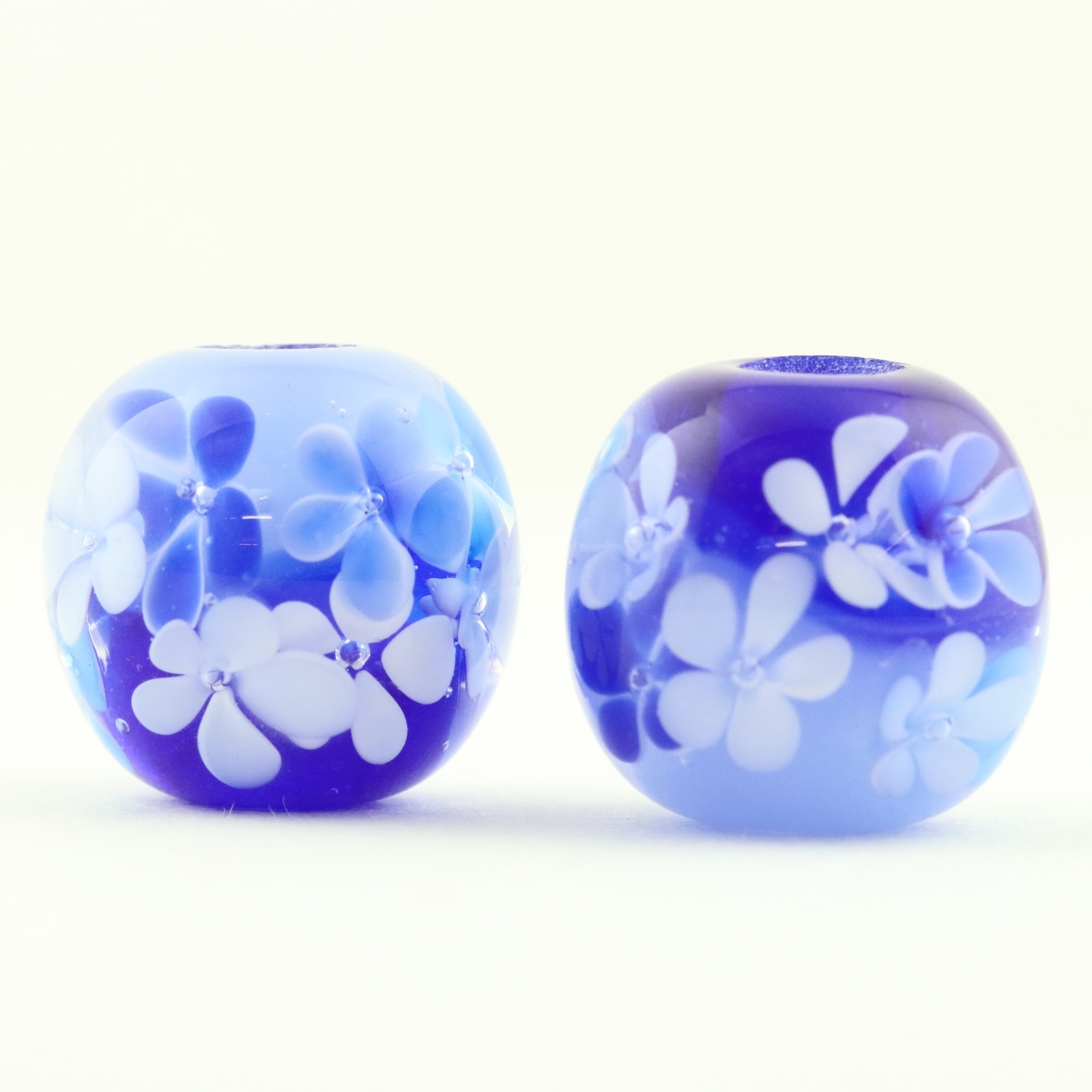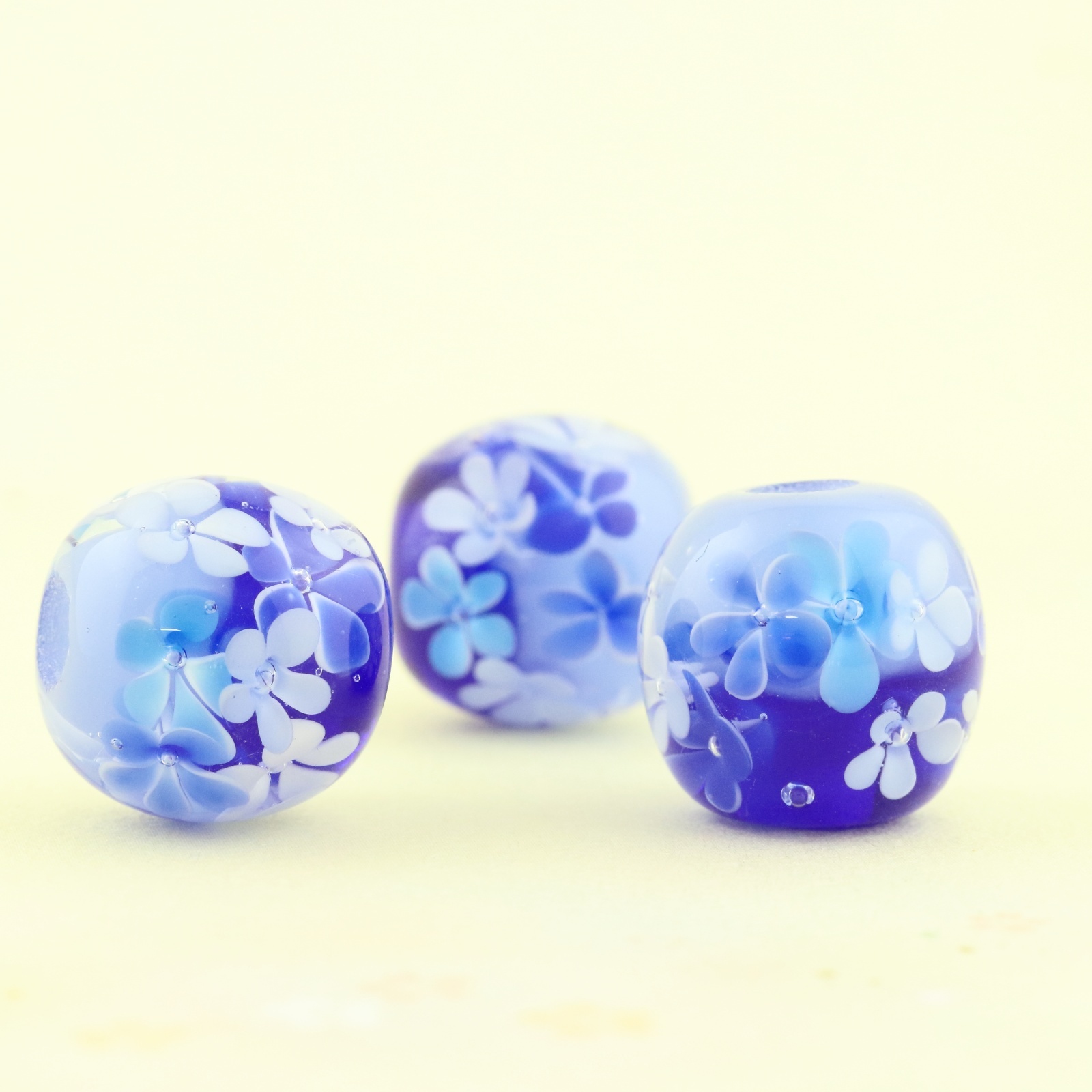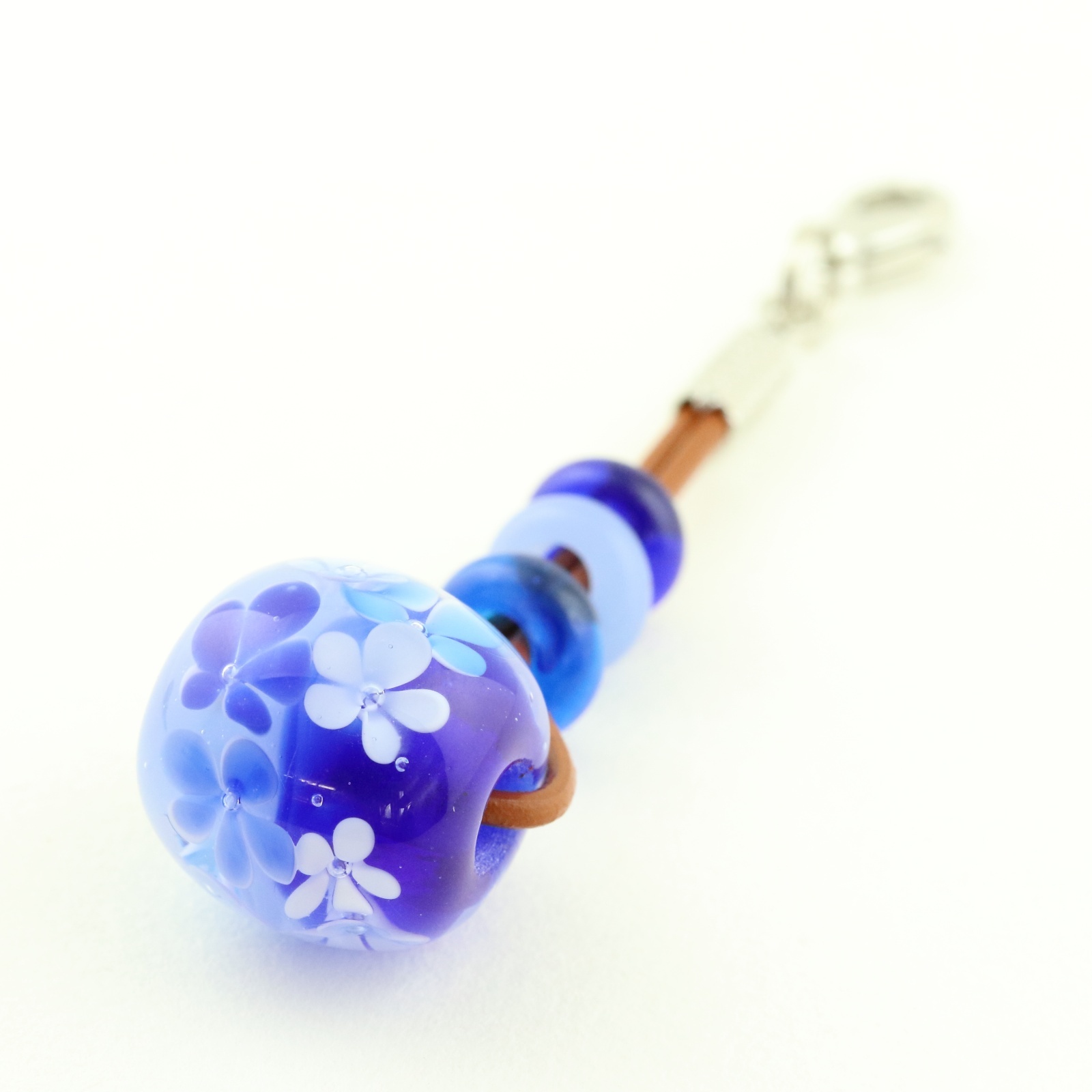 青や白のお花が咲き清涼感のあるとんぼ玉です